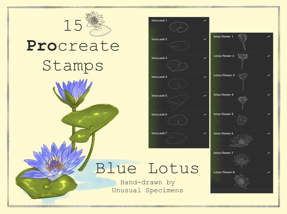 15 Beautiful hand-drawn Blue Lotus stamps for Procreate! This highly detailed set of stamps includes 8 flower illustrations and 7 pads. For personal and commercial use.