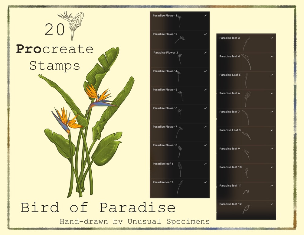 20 beautiful hand-drawn Bird of Paradise stamps for Procreate. This highly detailed set includes 8 flowers and and 12 leaves. For commercial and personal use.
